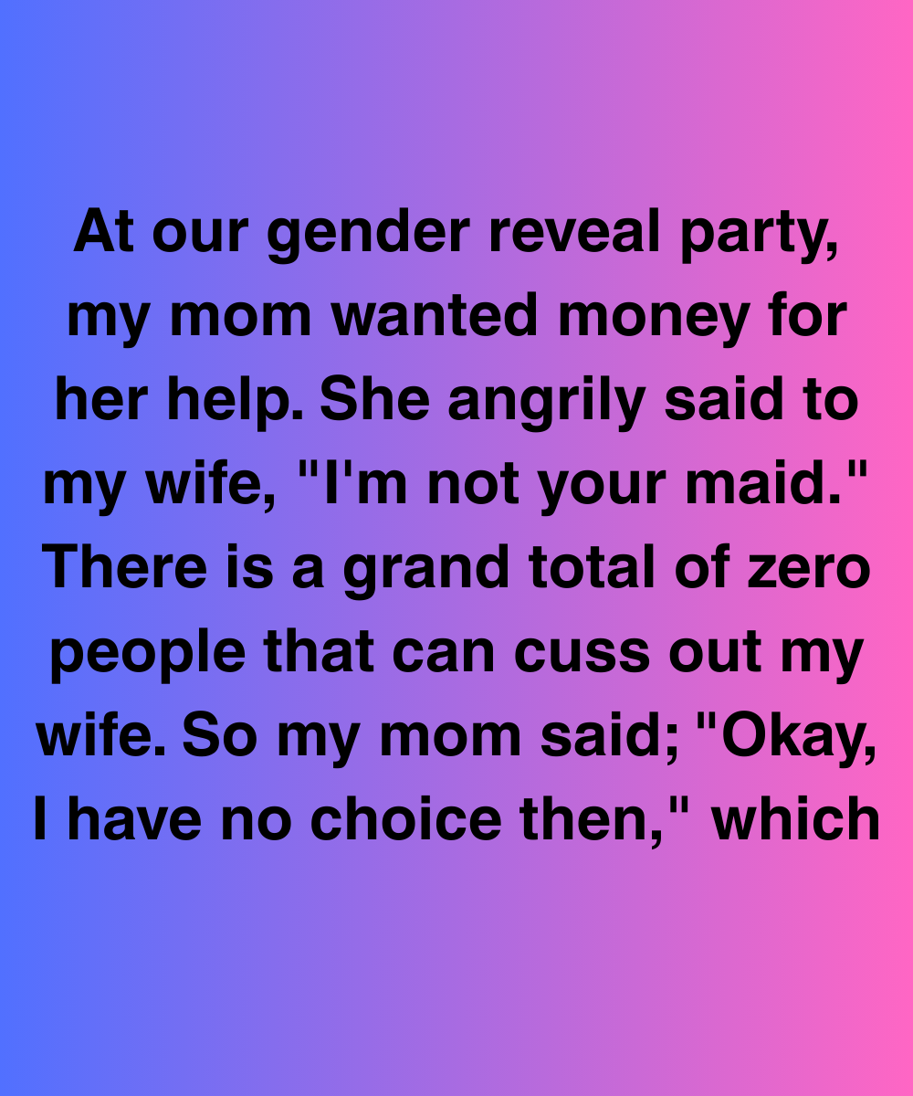 “At our gender reveal party, my mom wanted money for her help. She angrily said to my wife, ‘I’m not your maid.’ There is a grand total of zero people that can cuss out my wife. So my mom said, ‘Okay, I have no choice then,’ which made the whole room go silent.”