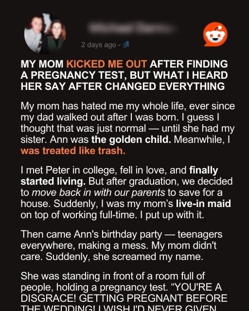 Peter’s parents took us in, and weeks later I returned for my belongings. At the door, I overheard my mother confronting Ann—it was her pregnancy test all along. Ann admitted she stayed silent while I was shamed and kicked out. The truth eventually spread through the neighborhood, tarnishing my mother’s image, but she never apologized.
