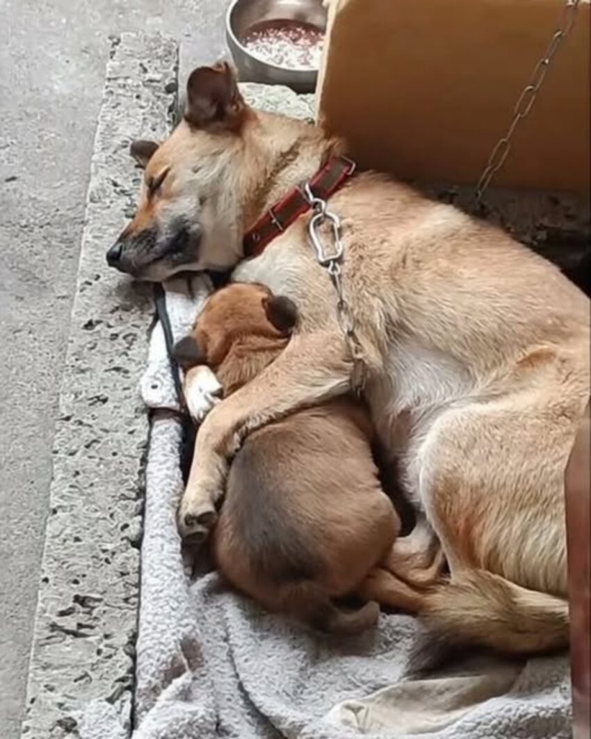 She lies quietly, but her stillness is not without purpose. Her ears catch every sound, her eyes scan for every shift in the air. When a gust of wind rattles nearby or an unfamiliar noise creeps too close, she instinctively pulls them tighter beneath her, as if her body alone could form a fortress against the world. And perhaps it can—because in her embrace, nothing harmful dares to enter.