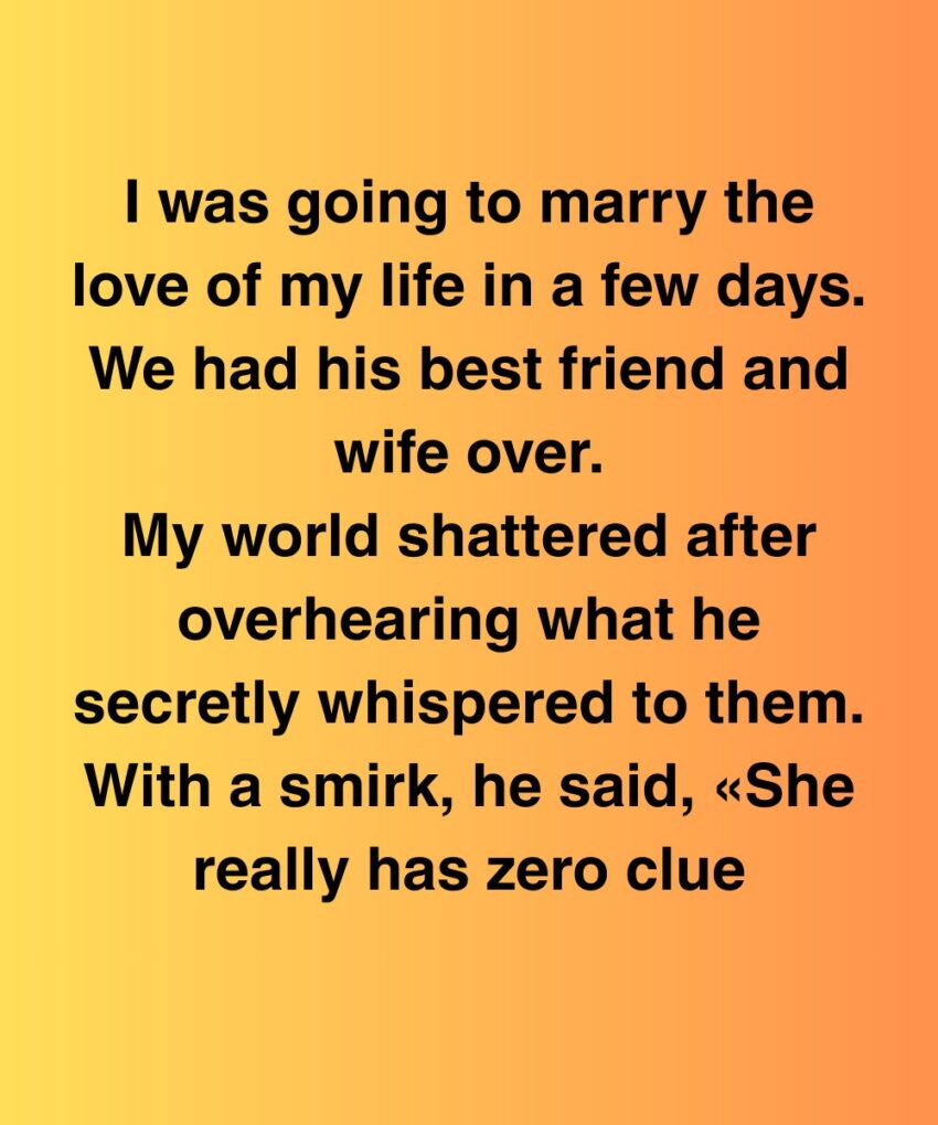I was going to marry the love of my life in a few days. We had his best friend and wife over. My world shattered after overhearing what he secretly whispered to them. With a smirk, he said, “She really has zero clue.”