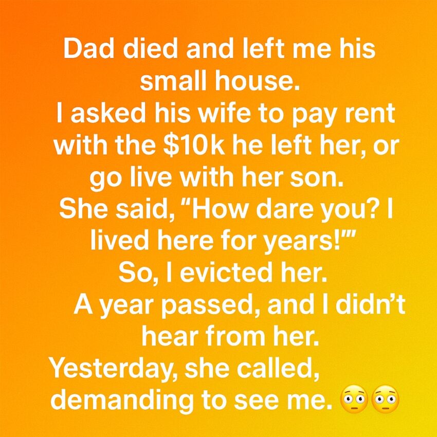 When Dad passed, he left me his small house and gave his wife a separate sum of money. It wasn’t much, but it was his way of making sure both of us had something. For me, that house was more than property—it was a piece of him I could hold on to.