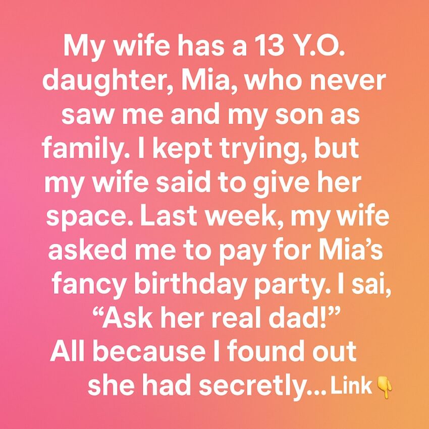 My wife has a 13-year-old daughter, Mia, who never saw me and my son as family. I kept trying, but my wife always told me to give her space. Last week, my wife asked me to pay for Mia’s fancy birthday party. I said, “Ask her real dad!”All because I found out she had secretly been saving messages from him—grand promises of expensive gifts and trips, none of which ever happened.