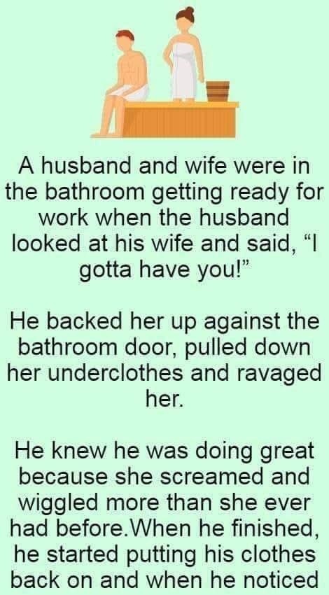A husband and wife were in the bathroom getting ready for work when the husband looked at his wife and said, “I gotta have you!” He backed her up against the bathroom door, pulled down her underclothes and ravaged her. He knew he was doing great because she screamed and wiggled more than she ever had before.