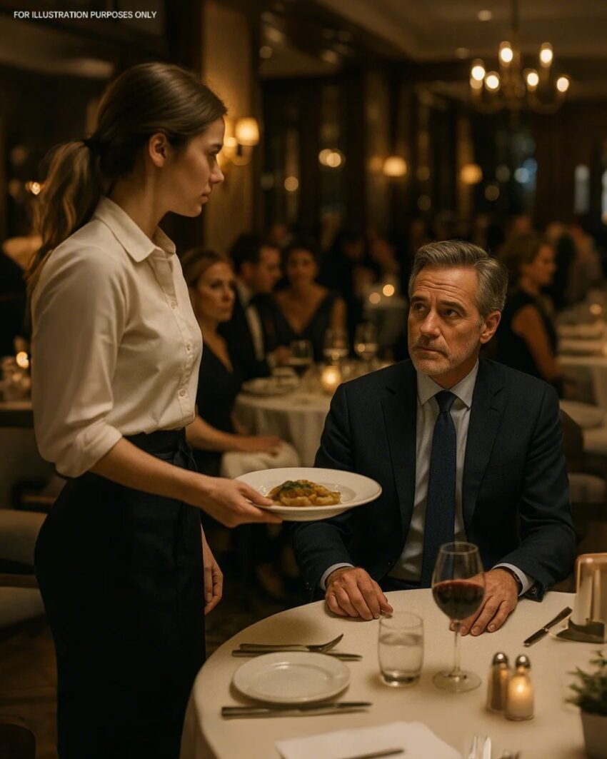 A young waitress approached, balancing two dishes with effortless grace. She couldn’t have been more than twenty, dressed simply, yet there was a quiet dignity in her presence. As she placed Nathaniel’s plate in front of him, her eyes briefly met his.