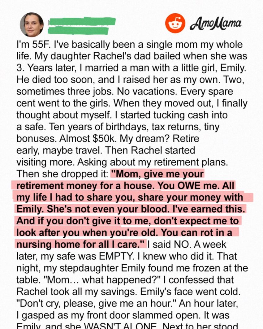 “All my life, I had to share you, Mom,” Rachel went on, her voice growing louder. “I’ve had to share everything with someone who isn’t even our blood. You gave her as much as me… maybe more. And now you want to keep all that money for yourself? After everything I had to give up?”