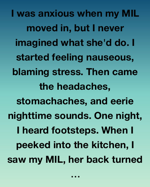 I was anxious when my MIL moved in, but I never imagined what she’d do. I started feeling nauseous, blaming stress. Then came the headaches, stomachaches, and eerie nighttime sounds. One night, I heard footsteps. When I peeked into the kitchen, I saw my MIL, her back turned.