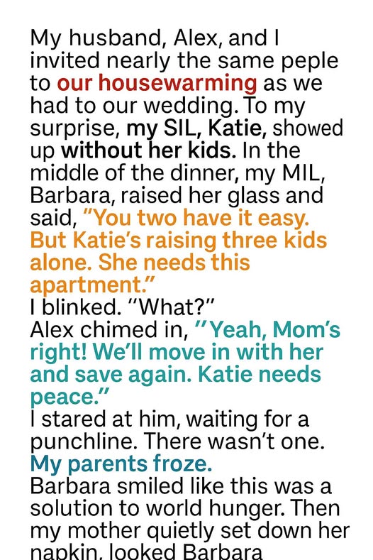 I felt my smile falter as he added, “Yeah… Katie really needs a fresh start. We could stay with your parents for a while until we get back on our feet again.”The room went silent. A couple of guests glanced at me, waiting for me to laugh it off. But this wasn’t a joke. My mother‑in‑law, always so good at playing the martyr, had just publicly demanded that I give up the home I worked so hard to buy — and my husband was backing her up.
