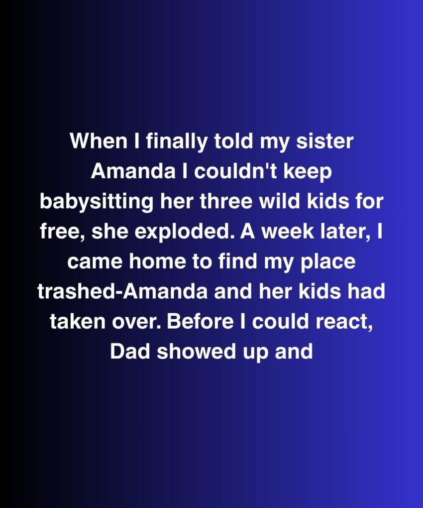 When I finally told my sister Amanda I couldn’t keep babysitting her three wild kids for free, she exploded. A week later, I came home to find my place trashed—Amanda and her kids had taken over. Before I could react, Dad showed up and just stood in the doorway, staring like he couldn’t believe what he was seeing.