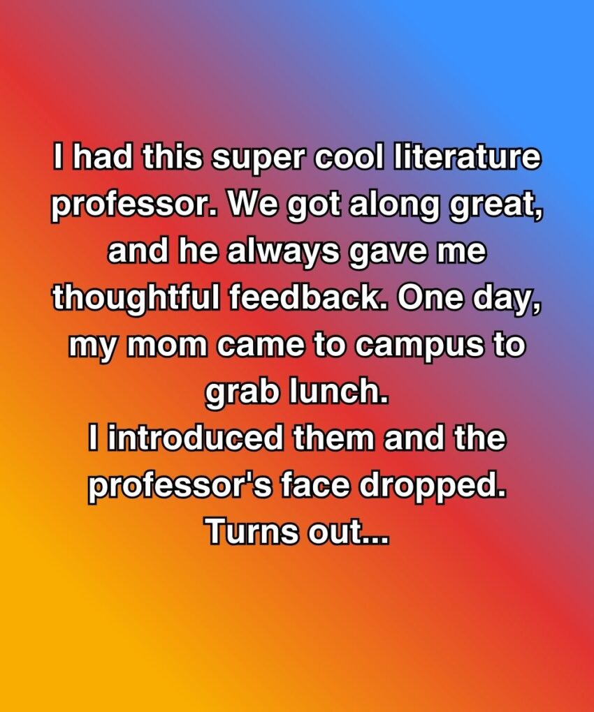 I had this super cool literature professor. We got along great, and he always gave me thoughtful feedback. One day, my mom came to campus to grab lunch.