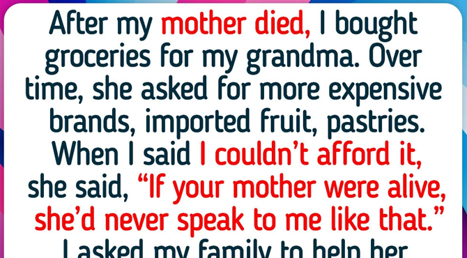 That hit me hard. I drove over with what I could: bread, milk, and some fruit. When I got there, she looked in the bag and said, “No steak? No cake?” I froze. I realized she didn’t see it as help anymore… she saw it as her right. That’s when I decided: no more weekly groceries. I’ll visit, I’ll help when I can, but I’m done being her personal delivery service.