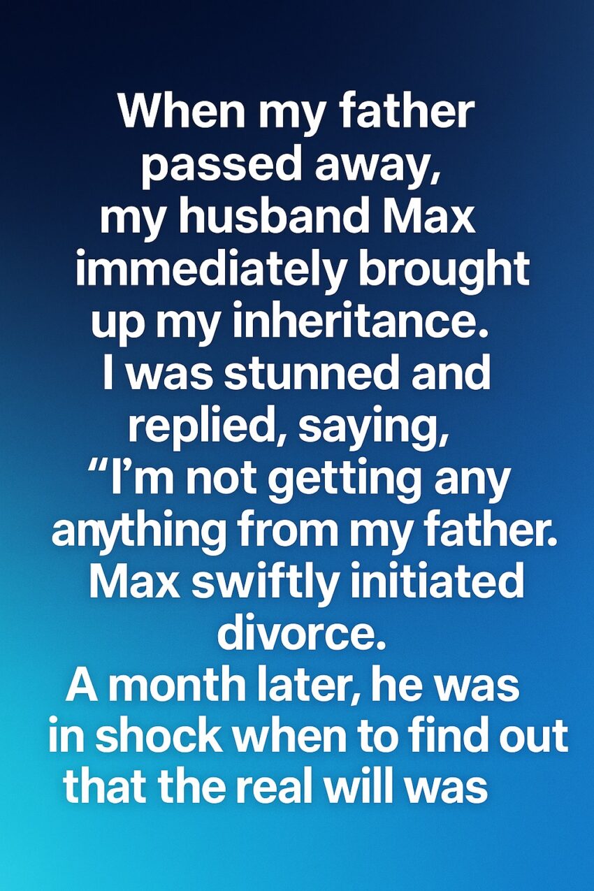 When my father peacefully left this world, my heart felt heavier than ever before. During those quiet days, my husband Max surprised me by bringing up the topic of inheritance. His timing unsettled me, but I tried to brush it aside. When I told him I expected nothing, he grew distant. I didn’t realize that moment would change everything.