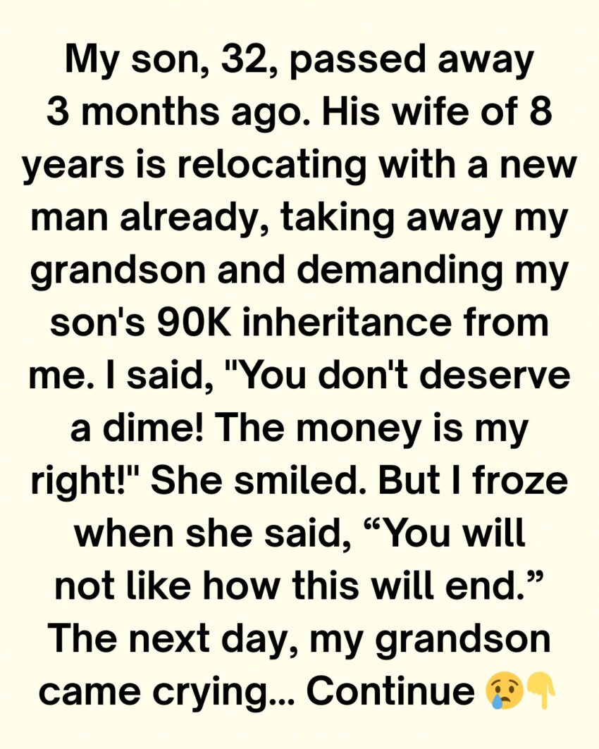 His wife of eight years—my daughter-in-law—moved on with astonishing speed. Before I could even catch my breath, she announced she had a new man and was relocating to New York with him. As if that wasn’t enough, she demanded my son’s $90,000 inheritance.