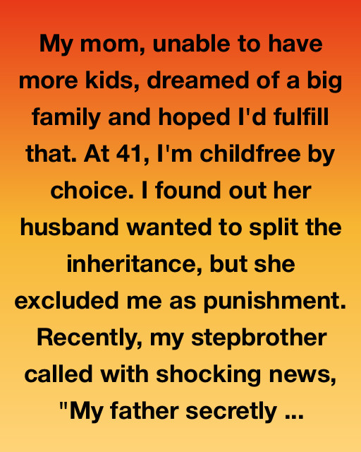 My mom, unable to have more kids, dreamed of a big family and hoped I’d fulfill that. At 41, I’m childfree by choice. I found out her husband wanted to split the inheritance, but she excluded me as punishment. Recently, my stepbrother called with shocking news, “My father secretly added you back into the will last year, behind Mom’s back.”