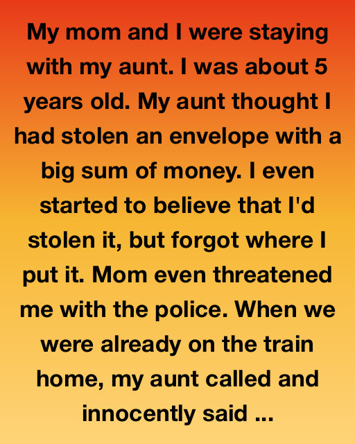 When we were already on the train home, my aunt called and innocently said, “Oh, I found it! It slipped behind the drawer.”I remember the silence that followed. My mom didn’t say a word for a long minute. She just held the phone close to her ear, her face tight, her knuckles pale from gripping it so hard. I didn’t really understand everything back then, but I knew I wasn’t supposed to breathe too loud. Then she muttered something like “okay” and hung up.