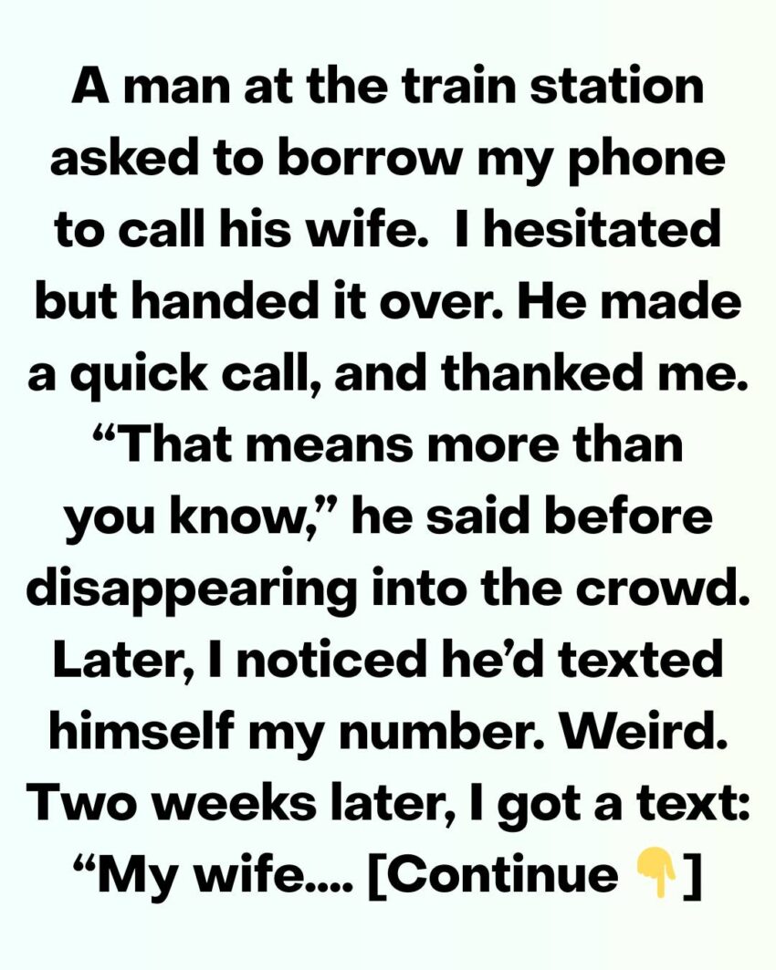 I was waiting for my train when a man approached me—middle-aged, tired eyes, suit wrinkled like he’d slept in it. He cleared his throat and asked softly, “Could I borrow your phone to call my wife? Mine just died.”