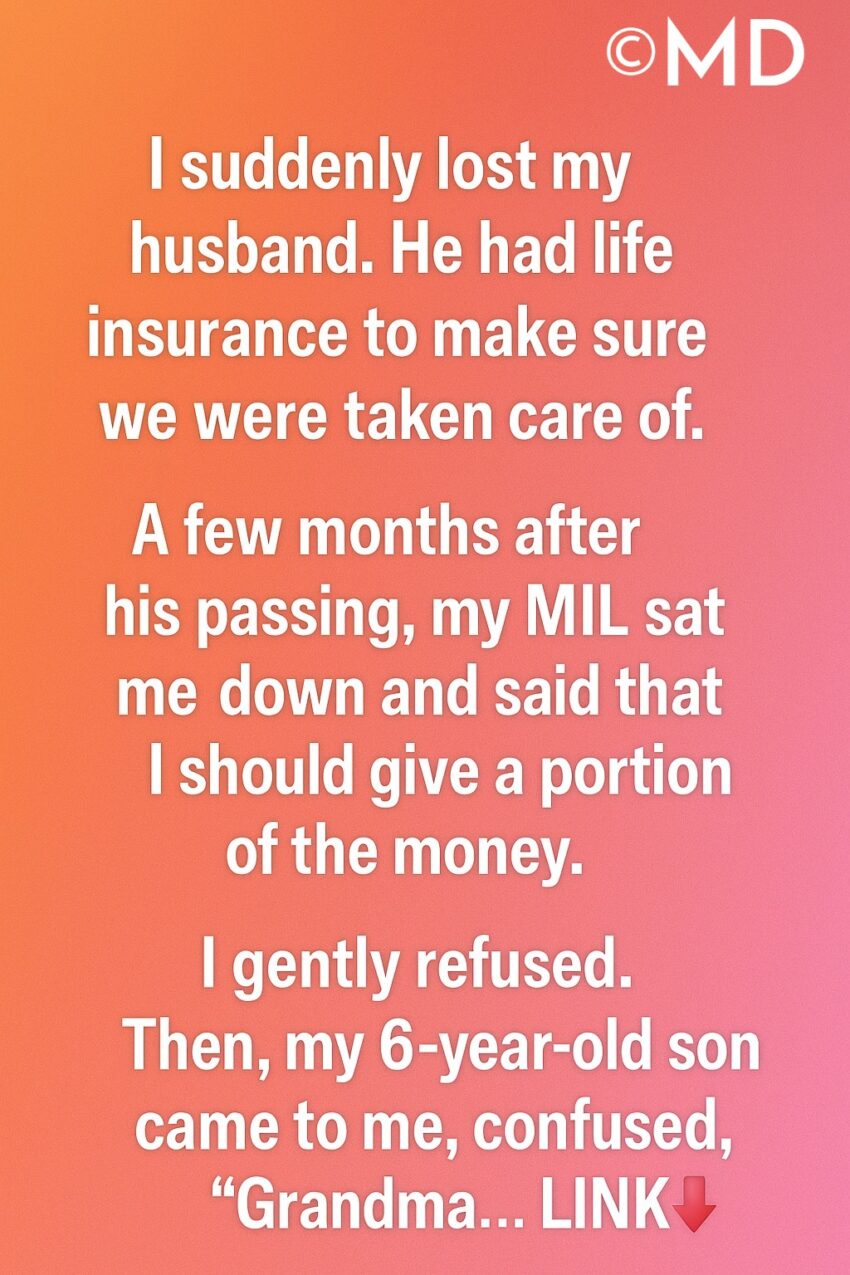 I suddenly lost my husband. He had life insurance to make sure we were taken care of. A few months after his passing, my MIL sat me down and said that I should give a portion of the money. I gently refused. Then, my 6-year-old son came to me, confused, “Grandma…” he whispered, as if unsure whether he was allowed to continue. I knelt down and asked what he meant, and he explained that she had talked to him too—telling him that “sharing is what good families do.” His small voice carried a weight he didn’t understand, and hearing it made my heart ache