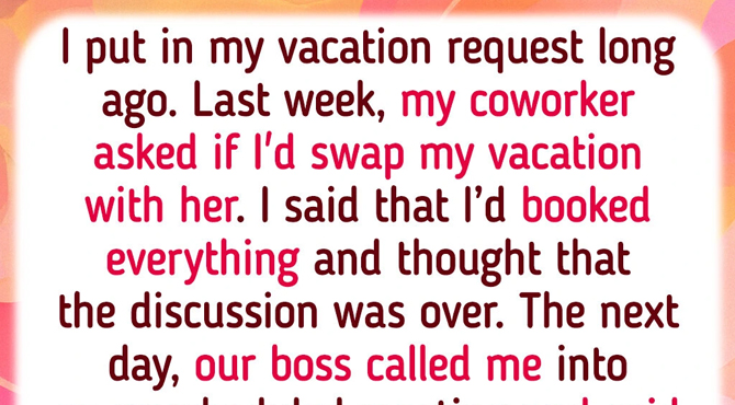 One man found himself in a tough spot when his coworker—who happens to be a mom—asked him to swap a vacation. When his boss stepped in, things got even more complicated. Was he wrong to say no? Get a closer look at his story.