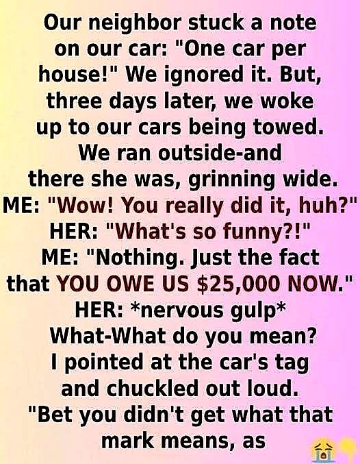 The color drained from her face as she stammered, “I-I didn’t know…” “Well,” I said, grinning, “maybe next time you’ll think twice before trying to make up your own rules.” The tow trucks unhooked our cars and drove off. As for our neighbor, she never brought up parking again. In fact, she avoids eye contact whenever she sees us now.