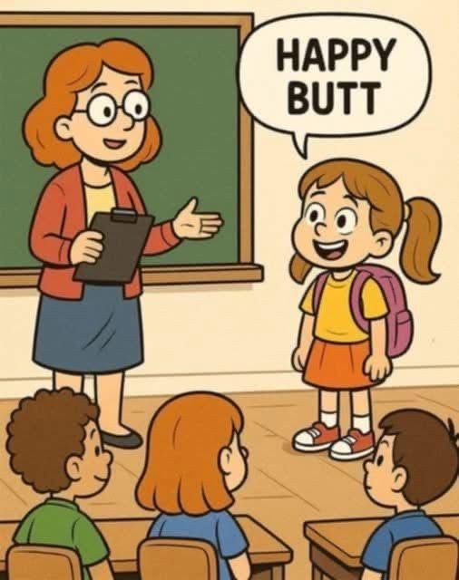 Some classroom and parenting moments are so unexpectedly honest that they become stories people retell for years. From a child proudly introducing herself as “Happy Butt,” to a creative student turning green, pink, and yellow into a chaotic phone call, to a little girl calmly asking how long her father would serve jail time if she skipped school—each moment proves that kids see the world with an unfiltered logic adults can’t compete with
