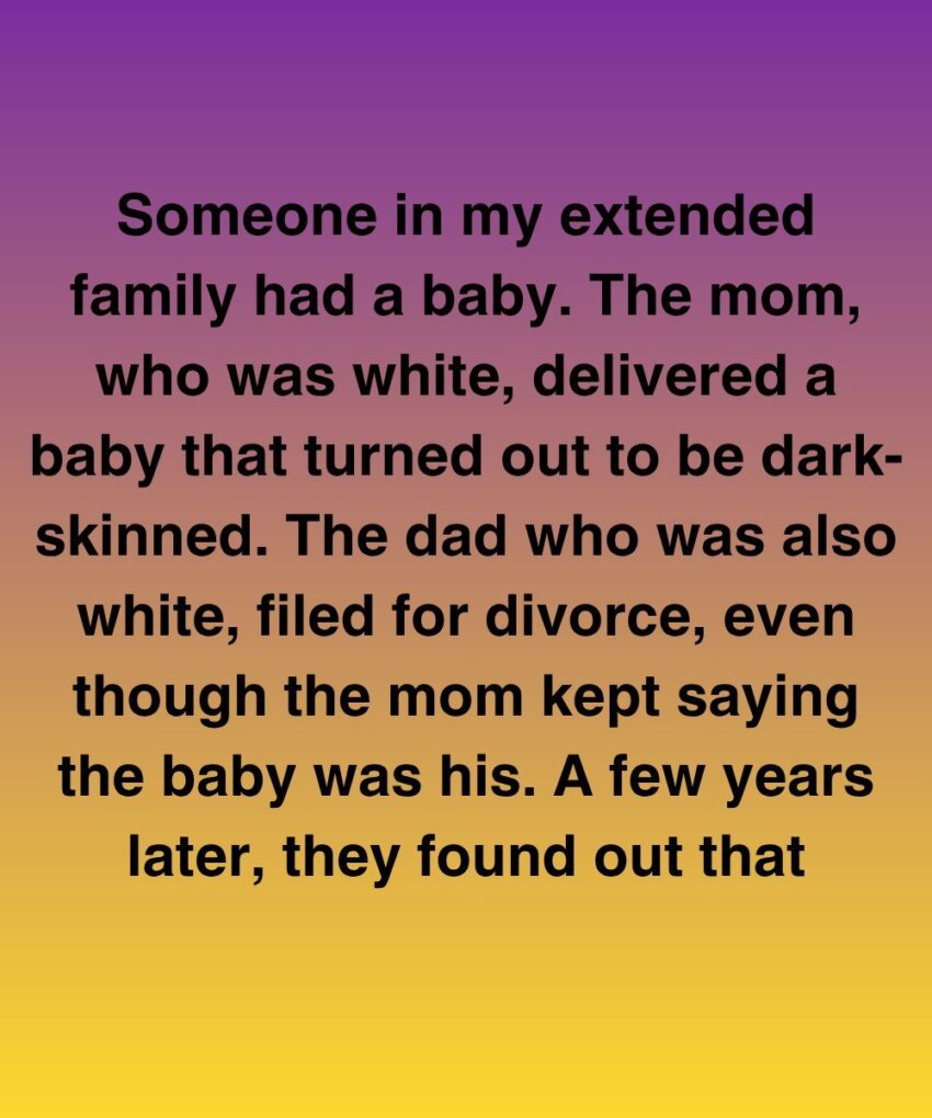 Someone in my extended family had a baby. The mom, who was white, delivered a baby that turned out to be dark-skinned. The dad who was also white, filed for divorce, even though the mom kept saying the baby was his. A few years later, they found out that everything wasn’t as simple—or as scandalous—as it had seemed.