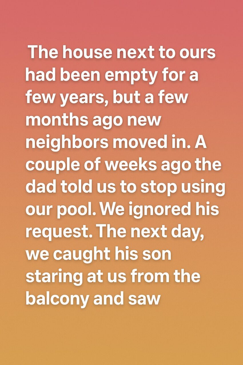The house next to ours had been empty for a few years, but a few months ago new neighbors moved in. A couple of weeks ago the dad told us to stop using our pool. We ignored his request. The next day, we caught his son staring at us from the balcony and saw a look on his face that seemed more confused than upset, almost as if he was trying to understand why we were swimming there in the first place. At first, we brushed it off, thinking he was just curious about the neighborhood or trying to get used to his new surroundings. After all, moving into a new home after years of vacancy can be overwhelming, and people often need time to adjust. Still, it felt unusual that the father had told us to stop using something that clearly belonged to our property. We decided not to make a big deal of it, but the moment lingered in our minds longer than expected.