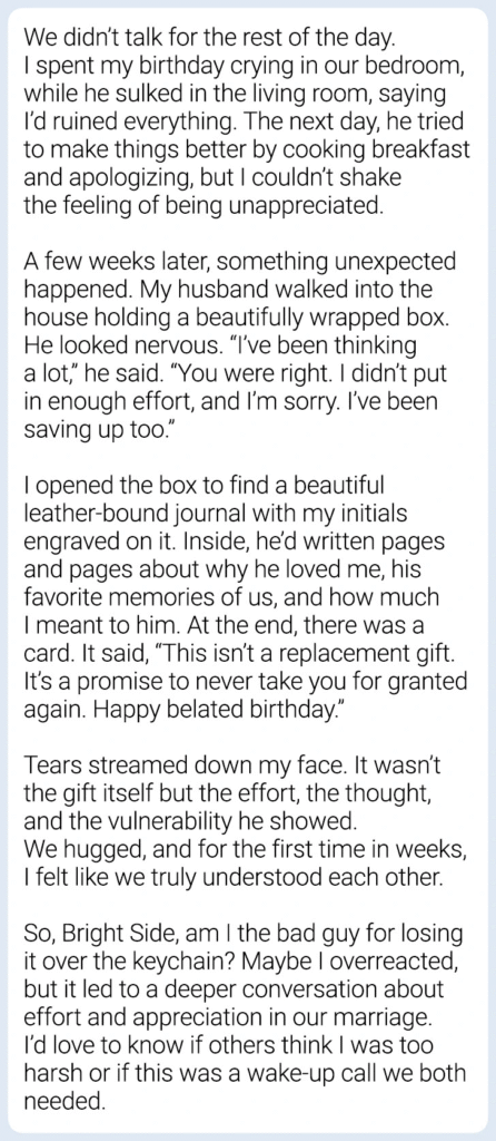 When you confronted your husband about the keychain, the conversation quickly turned tense. His defense that “it’s not about how much a gift costs” missed the point. While it’s true that the monetary value isn’t everything, the effort behind a gift speaks volumes. You weren’t asking for extravagance but rather for acknowledgment of your hard work and dedication.
