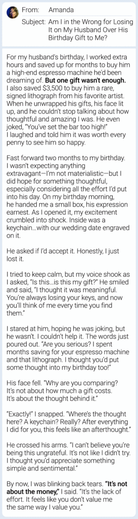 n the intricate dance of relationships, few things highlight the complexities of love and appreciation as vividly as gift-giving. Whether it’s a grand gesture or a simple token, each present carries with it a world of emotions, expectations, and unspoken messages. Today, we bring you a poignant letter from Amanda, a woman who found herself at the crossroads of gratitude and disappointment when her heartfelt efforts were met with what she perceived as an underwhelming response.