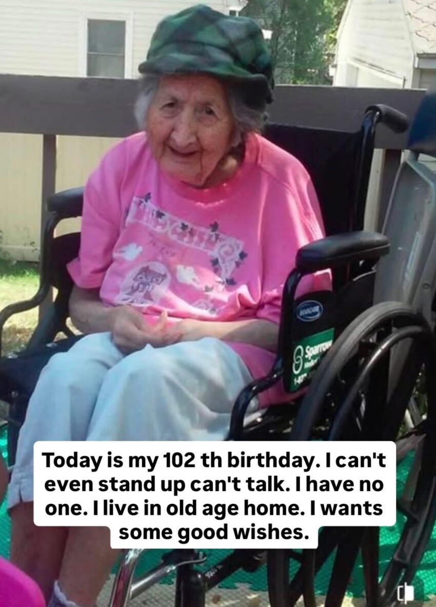 She sat quietly in her wheelchair near the window of the old age home, her fragile hands folded neatly on her lap, trembling slightly from age and time. At 102 years old, her voice had grown too weak to speak more than a few soft whispers, and her legs no longer had the strength to carry the woman who once ran through fields, danced barefoot on warm summer nights, and carried children in her arms with endless love