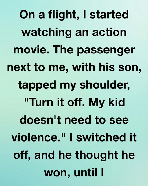 On a flight, I started watching an action movie. The passenger next to me, with his son, tapped my shoulder, “Turn it off. My kid doesn’t need to see violence.” I switched it off, and he thought he won, until I noticed the discomfort behind his request. At first, I felt slightly annoyed—after all, I had chosen the movie quietly, using my headphones, and wasn’t disturbing anyone. But when I glanced at his son, a small boy clutching a stuffed dinosaur and staring nervously at the seat in front of him, I sensed there was more to the story. The father looked stressed, tired, and protective—not confrontational. So instead of arguing, I closed the movie app and let the moment pass. As the plane settled into its cruising altitude, I opened a book instead, hoping to ease the tension between us.