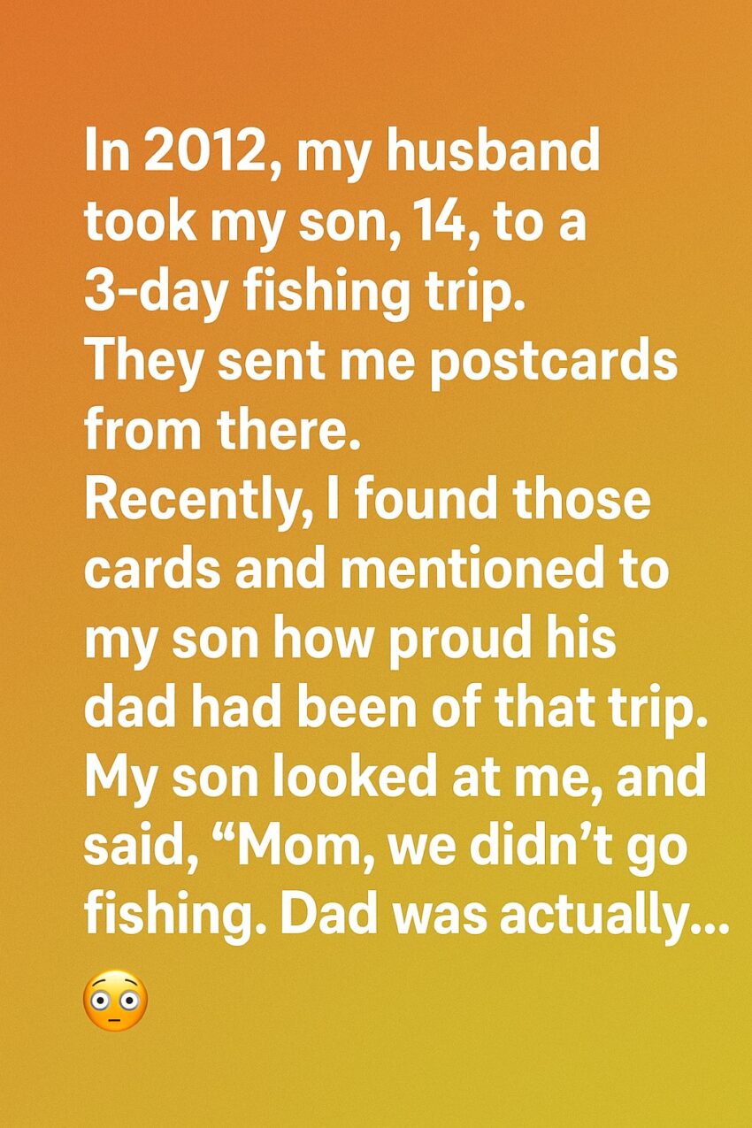 In 2012, my husband took my son, 14, to a 3-day fishing trip. They sent me postcards from there. Recently, I found those cards and mentioned to my son how proud his dad had been of that trip. My son looked at me, and said, “Mom, we didn’t go fishing. Dad was actually…“…teaching me something he didn’t know how to explain to you at the time.” His words made me pause, not out of worry, but curiosity. He continued slowly, choosing each word with care. My husband had always been a private man—gentle, thoughtful, but sometimes unsure of how to communicate his deeper feelings. My son explained that instead of fishing, they had spent those three days hiking, talking, and learning how to navigate trails. The postcards, he said, were meant to reassure me that everything was going smoothly, because my husband didn’t want me to worry about them wandering through unfamiliar terrain. It wasn’t deception as much as it was his way of protecting both of us while creating a quiet space for father-and-son bonding.