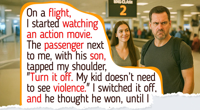 For the rest of the flight, not a single word. Not even during landing. But at baggage claim, he finally turned to me and said, ’You embarrassed me in front of my son.’ I said, ’Oh, I didn’t mean to. I just thought we were keeping things family-friendly.’