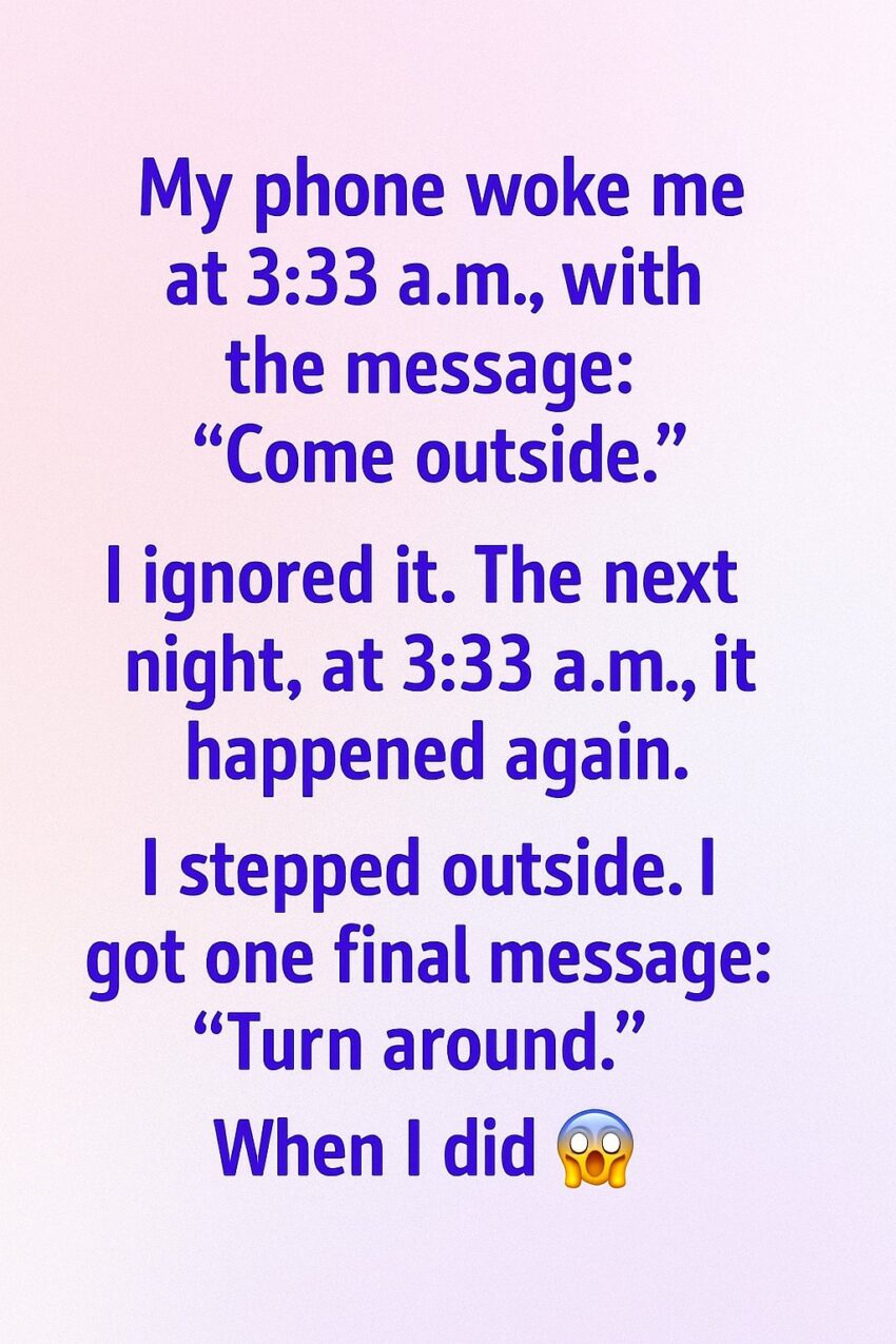 The next night, again at 3:33 a.m., the familiar chime snapped me awake. My phone vibrated against the nightstand, almost impatiently. This time, the message was identical: “Come outside.” A ripple of unease spread across my chest. I checked the door locks, the windows, everything I could control, yet the feeling wouldn’t go away. I considered blocking the number, but something stopped me—curiosity, perhaps, or the strange sense that the message wasn’t meant to frighten me at all. It felt more like a summons, as if whoever—or whatever—was sending it believed I had been expecting it. Unable to fall back asleep, I sat in the dark until sunrise, watching the shadows shrink as the sky turned gold.