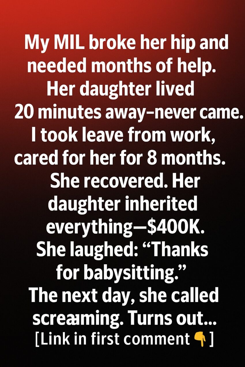 Eight months later, she was walking again, cooking simple meals, and even laughing at her favorite shows. I felt proud of her progress and grateful that I could help her through such a vulnerable time. But that feeling shifted abruptly when her daughter announced the reading of the will. Everything—her savings, her home, her remaining investments—had been left to her daughter. Four hundred thousand dollars. I wasn’t expecting anything, but I also wasn’t expecting mockery. Her daughter glanced at me with a smirk and said, “Thanks for babysitting. Really saved us a lot of money.” The words stung far more than I cared to admit. My mother-in-law lowered her gaze, as if she, too, felt the weight of the moment but couldn’t find the courage to speak.